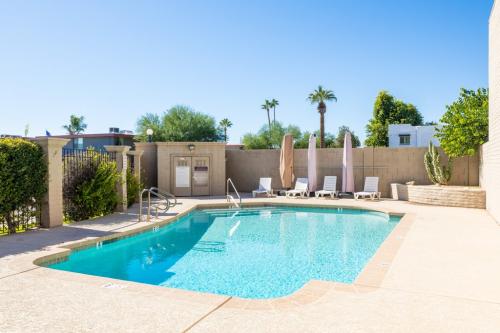 Perfectly positioned in the highly walkable Camelback Corridor, this stunning and stylish 2-bedroom, 1.5-bath home combines modern updates with effortless charm. Quiet cul-de-sac spot in Regency Circle with welcoming front paver-stone patio entry. Updated kitchen shines with white Shaker-style cabinetry, newer stainless appliances and glass front cabinets with soft-close drawers. The open layout with neutral flooring flows to a sunny private patio featuring gas fire feature and sweet orange tree. A rare private oversized garage with extra storage room! Total enjoyment of your unit with no shared walls with neighbors. Upstairs both bedrooms are light filled and larger west bedroom features mini-split system with bedside remote and app for concentrated, efficient cooling. Full bath features updated walk-in tiled shower, while a downstairs powder room and large indoor laundry space adds everyday ease. Featuring dual-pane low-e windows, new window blinds and a newer roof (2023 recoat of 2013-installed new foam), this move-in-ready home offers both style and peace of mind. Lap-length community pool just steps away, serving the 17-home boutique community. Just minutes from Uptown Plaza, Luci's, and favorite neighborhood dining - experience the best of Camelback Corridor living in this beautifully maintained retreat.