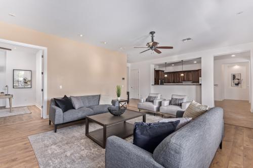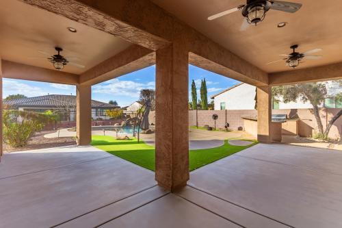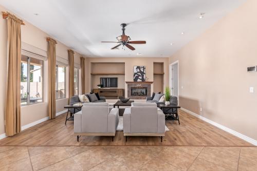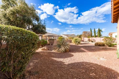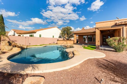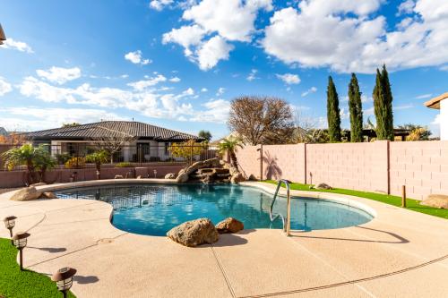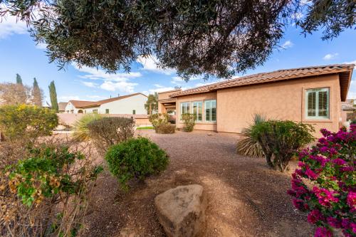 BEAUTIFUL HOME, PREMIUM LOT, AMAZING PRICE, WONDERFUL COMMUNITY. Open concept floorplan on large premium lot backing recessed walking trail & greenbelt with distant mountain views. Spacious greatroom w/gas fireplace & expansive view to resort backyard. Kitchen open to greatroom is loaded with cabinets & counter space, 5 burner gas cooktop & stainless steel appliances, ideal for family gatherings. Primary bedroom is split with two walk-in closets. Guest wing offers two additional bedrooms, full & half baths. Fourth bedroom with french doors is split currently used as an office. Formal dining room off entry has view to front courtyard, could be used as a flex area. 12,600 Sq. Ft. lot features large play pool with cascading rock waterfall, BBQ with granite topped high-top seating and two large covered patios. Three car tandem garage with workbench and service door.