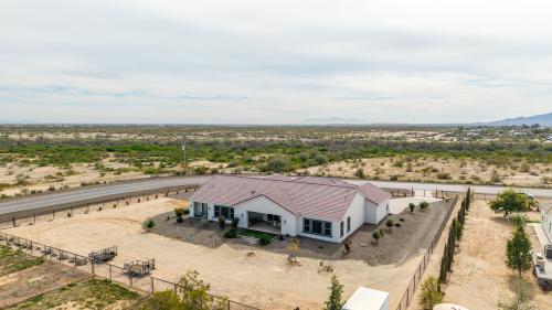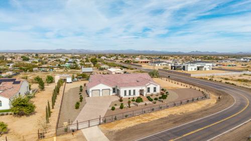 Luxurious Modern Custom Estate on Over ¾ Acre! Experience refined desert living in this impeccably designed modern custom home, perfectly situated on over three-quarters of an acre with unobstructed, serene desert and mountain vistas. Every detail has been thoughtfully curated, from soaring 10-12' ceilings and solid 8' doors to upgraded luxury vinyl plank and designer tile flooring throughout. The expansive open-concept Kitchen and Great Room create an ideal space for both everyday living and grand entertaining. The gourmet kitchen is a showpiece, featuring abundant cabinetry, granite countertops, tile backsplash, top-tier light fixtures, and a massive walk-in pantry. Enjoy both formal and casual dining areas, while dramatic 4-panel sliding doors seamlessly blend indoor and outdoor living. A beautifully tiled fireplace anchors the main living space with warmth and sophistication. The primary suite is a private retreat, offering a spa-inspired bath with a resort-style walk-in shower, separate soaking tub, and a dual-entry walk-in closet that conveniently connects to the oversized laundry room. Two additional en-suite bedrooms each feature walk-in showers, providing comfort and privacy for guests or family. A spacious den with its own courtyard exit offers versatility as a home office, lounge, or optional fourth bedroom. Thoughtful touches continue throughout with refined hall cabinetry, premium finishes, and exceptional craftsmanship. Car enthusiasts and hobbyists will appreciate the extensive parking and flexible garage options, including a long paver driveway, side RV gate, extended-length 2-car garage, and a separate third-car garage with sliding door courtyard access - ideal for a workshop, fitness studio, or car. The fully fenced yard is designed for easy maintenance and maximum enjoyment, featuring desert landscaping, artificial turf, a travertine patio, and elegant paver steps. With ample room to add a pool, RV parking, horse facilities, or create your own custom outdoor oasis, the possibilities are endless. This extraordinary property offers luxury and panoramic natural beauty - an absolute must-see. Furnishings available on a separate bill of sale.