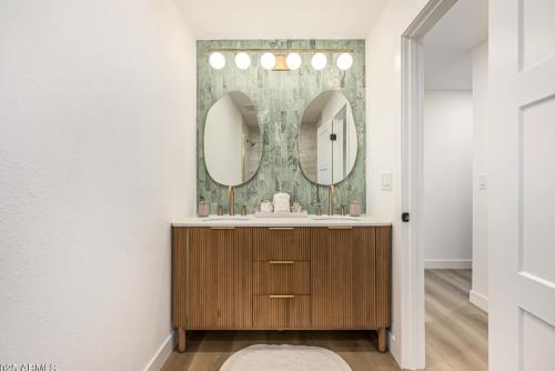 Discover mid-century charm in this fully permitted, top-to-bottom remodel! 4-bed, 2-bath home in the coveted Litchfield Park Proper. Premium corner lot adjacent to a serene park, with exceptional curb appeal, manicured artificial turf landscape, and 2-car garage. Inviting open floor plan boasts a chef's kitchen: slim shaker cabinets, terrazzo quartz counters, designer black appliances, accordion window with bar seating for outdoor entertaining. Split primary suite offers patio access, walk-in closet, and lavish ensuite. Expansive backyard includes covered patio/pergola and tiled flagstone seating. New AC, roof, ducts, main sewer line, water heater! Partially new wiring and water lines!