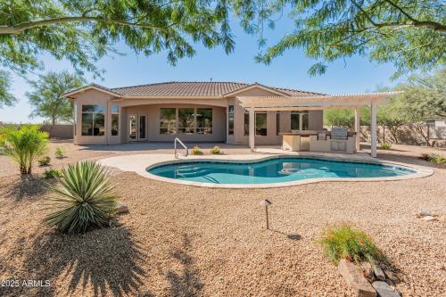 This stunning property captures the essence of Arizona living - space, privacy & natural beauty all in one. Set on a 1.3+ acre lot surrounded by mountain views and unforgettable sunsets, this meticulously maintained 2600 sqft single-level home won't disappoint. Featuring 4 bedrooms, 2.5 bathrooms, and a 3-car garage, the thoughtful floor plan balances comfort and versatility. The chef's kitchen boasts granite countertops, convenient center island, stainless appliances, gas cooktop, ample cabinetry, and a walk-in pantry - perfect for both culinary enthusiasts and entertainers. The oversized primary suite offers a true retreat, complete with a sitting area, private backyard access, and a custom walk-in closet. The large ensuite bath features a jetted soaking tub, walk-in shower, and dual sinks. Step outside to your private backyard oasis, designed for relaxation and gatherings. Enjoy the recently remodeled pebble tec pool, built-in gas BBQ, and covered patio, ideal for morning coffee or evening cocktails under the stars. Located just minutes from premier dining, shopping, multiple golf courses, and endless hiking trails, this home offers tranquil desert living without sacrificing convenience. Experience the perfect blend of elegance and the Arizona lifestyle - your dream home in Cave Creek awaits!