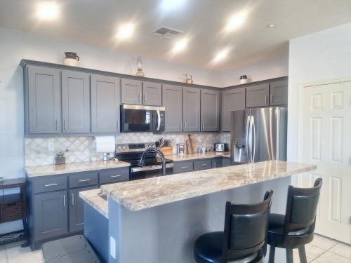 Welcome to this beautifully updated 3-bedroom, 2-bath home located in the highly sought-after gated Anthem Country Club, where country club living meets serene desert beauty. Step inside to find an inviting open layout enhanced by high ceilings and plantation shutters throughout. The elegant see-through fireplace adds warmth and charm to both the living, family room and dining spaces. *Floor Yr Updated 2020, Heating/Cool Yr Updated: 2018, Fully updated Kitchen in 2023* The gourmet kitchen is a true highlight with new cabinets, beautiful granite countertops, stainless steel appliances. Step outside to your own private desert oasis that backs to a desert wash with a covered patio, extended paver patio, tranquil 15-ft water feature, and sweeping desert and mountain views an ideal setting for relaxing evenings or hosting guests.