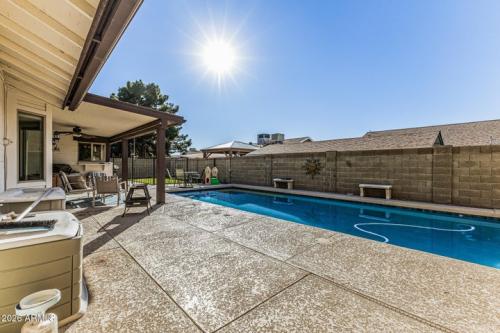 Exterior highlights include a 2-car garage, RV gate, mature landscaping, and a low-maintenance backyard with a covered patio, fenced grassy area, and sparkling pool—perfect for entertaining and Arizona living.