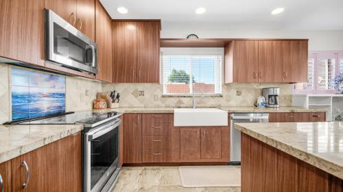 Welcome to this charming single-level home in northeast Mesa, where character and thoughtful design shine throughout. From the arched passageways to the custom cabinetry and real brick wood-burning fireplace, every detail adds warmth and personality. The kitchen is both beautiful and functional, featuring a large island, built-in wine fridge, appliance/mixer lift, granite countertops, decorative glass-front cabinetry, and abundant storage. Modern glass pendant and dining lighting add an upscale touch. Stainless steel appliances include a range, built-in microwave, dishwasher, and refrigerator. An apron-front sink and walk-in pantry with custom built-in storage complete the space.