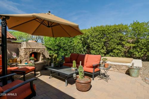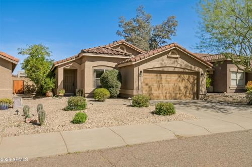 Discover the ease of single-level living from this beautifully upgraded home in Tatum Ranch featuring a light/bright GREAT ROOM floorplan. Gorgeous travertine floors throughout the living areas, granite counters & wood-look laminate flooring in the 3 bedrooms. The backyard is an entertainer's retreat w/ extended paver patio, built-in BBQ, outdoor fireplace, hot tub & plenty of room to relax or host friends in style. Fresh exterior paint & a newer water heater add peace of mind. The primary suite offers a large walk-in closet & abundant natural light. Tucked in a quiet spot yet close to Desert Ridge shopping, Cave Creek dining/entertainment & CC schools, this home is ideal for first-time buyers or anyone seeking a low-maintenance lock-and-leave getaway w/ wonderful indoor-outdoor living!