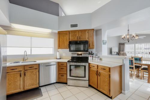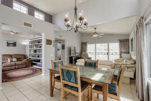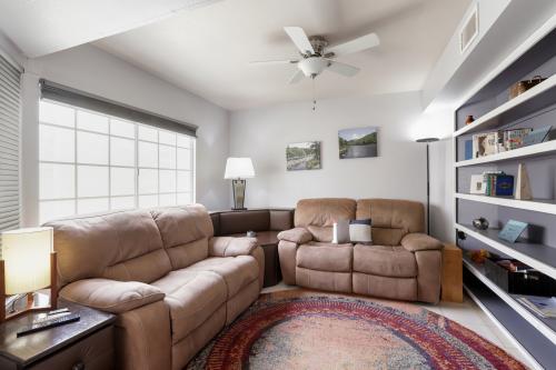Welcome to resort-style living in the guard-gated 55+ community of Sun Village! This beautifully maintained 2-bedroom + den home features an open-concept floor plan designed for comfort and easy entertaining. The spacious primary suite offers a rare private exterior entrance to the covered patio and fenced backyard--perfect for enjoying Arizona's beautiful mornings and evenings. Sun Village offers an unmatched active lifestyle with an array of amenities, including a scenic golf course, sparkling pools, tennis and pickleball courts, lakes, and a vibrant social calendar filled with clubs, events, and activities.
