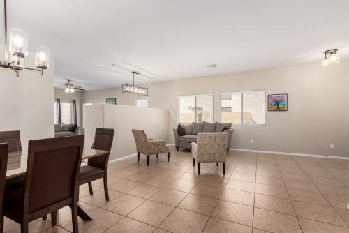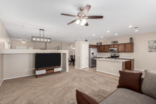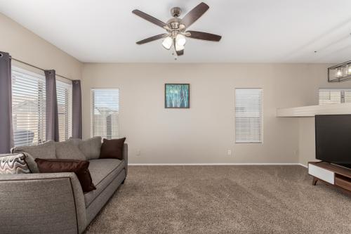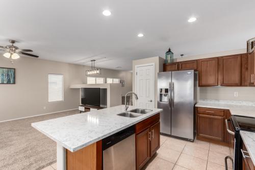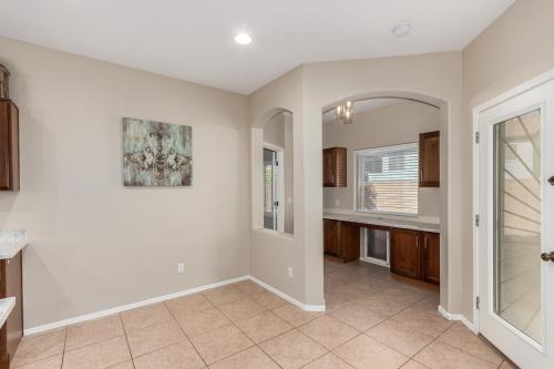 This beautiful single level, split floorplan, 3 bed + den, 2 bath residence in Skyline Ranch is looking for its new owners! Freshly painted inside and out, north/south exposure, great curb appeal, low maintenance landscape, and a 2 car garage are just the beginning. Inside you will find sizeable dining & living areas with tile in all the right places. The eat-in kitchen is open to the family room & comes equipped w/ample cabinetry, a pantry, stainless steel appliances, granite countertops, an island and butler's pantry. The primary suite showcases a full ensuite w/dual sinks , tile shower, garden tub and a walk-in closet. Also included is a nice sized backyard w/a covered patio. The community offers sand volleyball, basketball court and a playground area. This home is a true gem!