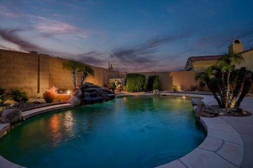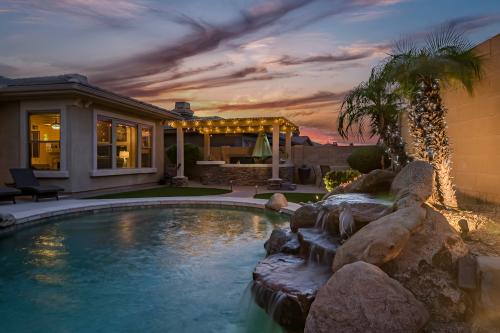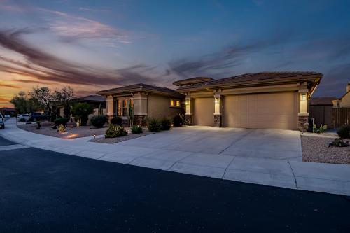 Welcome to your ultimate entertainment oasis nestled within the coveted gated Fairways neighborhood! This remarkable basement home, perfect for multi-family living, presents 5 bedrooms, 3.5 bathrooms, and an inviting pool! Lot's to love including brand new AC's! The chef's kitchen is a culinary delight, boasting granite countertops, a built-in refrigerator, gas cooktop, convection oven, and exquisite cherry cabinets equipped with convenient pull-outs. Enhanced tile flooring graces all high-traffic zones. Unwind in the open family room featuring a cozy gas fireplace. Your dreamy Master Retreat beckons with patio access, a spacious walk-in closet, a luxurious walk-in snail shower, dual vanities, and a relaxing soaker tub. Venture downstairs in the basement to ample additional living space, complemented by a wet bar. Outside, revel in your private backyard oasis complete with a shimmering pool, an outdoor fireplace, and a charming gazebo housing a built-in BBQ - perfect for entertaining! Additionally, relish the convenience of a three-car garage featuring built-in storage cabinets and epoxy floors. Embrace the amenities of the Master Planned Community of Estrella, including a public Troon golf course, two community pools, two fitness facilities, serene lakes, picturesque parks, enticing restaurants, a grocery store, and much more! Experience luxury living at its finest!