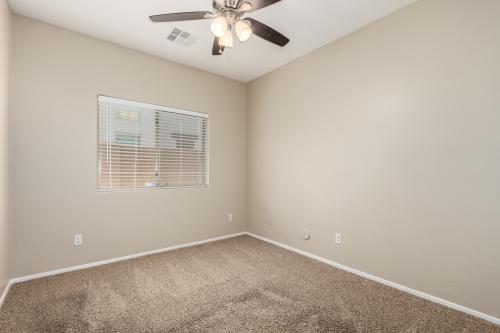 This beautiful single level, split floorplan, 3 bed + den, 2 bath residence in Skyline Ranch is looking for its new owners! Freshly painted inside and out, north/south exposure, great curb appeal, low maintenance landscape, and a 2 car garage are just the beginning. Inside you will find sizeable dining & living areas with tile in all the right places. The eat-in kitchen is open to the family room & comes equipped w/ample cabinetry, a pantry, stainless steel appliances, granite countertops, an island and butler's pantry. The primary suite showcases a full ensuite w/dual sinks , tile shower, garden tub and a walk-in closet. Also included is a nice sized backyard w/a covered patio. The community offers sand volleyball, basketball court and a playground area. This home is a true gem!