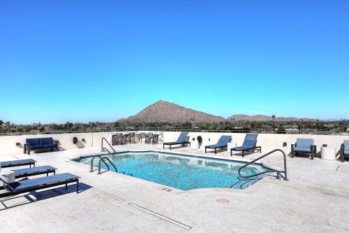 Wake up to PANORAMIC MOUNTAIN VIEWS in this Luxurious 5th-floor residence at the prestigious Mark Condo Building! Perfectly situated in the heart of the Historic Old Town Scottsdale Arts District this highly desired living is designed for those who value both elegance & experience. This Beautifully Remodeled 2 Bedroom & 2 Bath home offers an effortless blend of luxury and comfort. The Gourmet Kitchen was Partially Remodeled in 2021, features Upgraded Cabinetry, White Granite Countertops, a Walk-In Pantry, Premium Stainless Steel Appliances including a Viking Gas Range and GE Monogram Refrigerator ideal for entertaining or quiet evenings in. Spa-inspired Bathrooms, Travertine and Luxury Vinyl plank flooring, designer lighting, All New Ceiling Fans, and a Tiled patio create a sophisticated retreat. Just steps from world-class shopping, dining, art, and nightlife. Enjoy breathtaking panoramic views of the Superstition Mountains and Four Peaks by day and dazzling Scottsdale city lights by night from this exceptional residence at The Mark. Residents are pampered with daily concierge service, a highly secure building with state-of-the-art building security, a Secure Underground parking garage, and Two Reserved parking spaces. The Mark features a Fully Remodeled Heated Rooftop Pool & Spa, as well as a first-class BBQ area. (The Full Remodel of the Rooftop was Completed in 2024) Ownership also includes Full access to the iconic Valley Ho Hotel amenities, featuring room service, a 20% discount at The ZUZU Restaurant and The Valley Ho Spa, plus a 20% discount on guest rooms and suites. The HOA Fee covers A/C & Heat, Electricity, Internet, Water, Security, Concierge services, Lobby Coffee Bar, Building Pest Control, Fitness Center, and all Rooftop amenities. This is true lock-and-leave luxury living in one of Scottsdale's most sought-after and iconic locations.