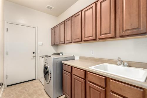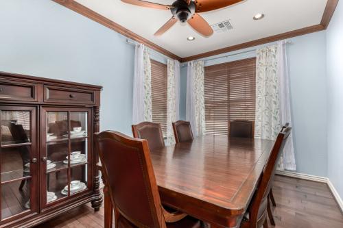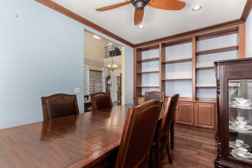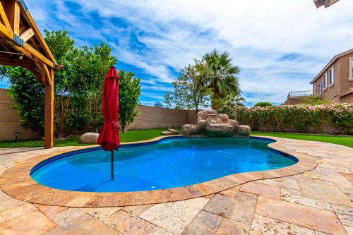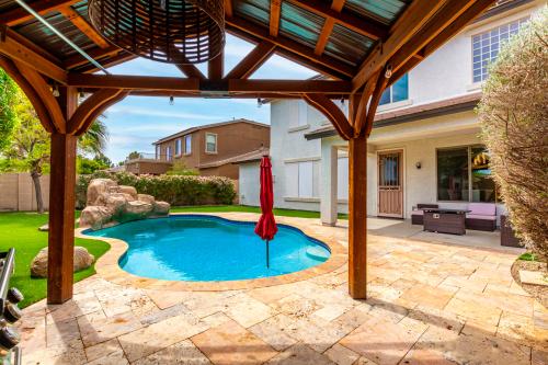 OPEN HOUSE SATURDAY, MAY 10TH, 2PM-5PM. BEAUTIFUL FORMER MODEL HOME WITH PEBBLESHEEN POOL AND 3 CAR TANDEM GARAGE! This spacious 4 Bedroom 2.5 Bath home boasts two-story high ceilings at the Formal Dining/Living Room, downstairs Den with built-in bookcase, upgraded hardwood and tile floors, granite countertops, walk-thru butler's pantry, tile backsplash, stainless steel appliances, gas fireplace, automated shades, wrought iron railing, Loft with built-in bookcase, large Primary Bedroom, huge walk-in shower with dual showerheads, crown molding, and the list goes on. Your backyard resort boasts a travertine deck, ramada, artificial turf, covered patio, and refreshing pool with waterfall feature. The front exterior welcomes you with a stone finish and extended driveway. Great location near schools, parks, and shopping! Must see!