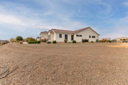 Luxurious Modern Custom Estate on Over ¾ Acre! Experience refined desert living in this impeccably designed modern custom home, perfectly situated on over three-quarters of an acre with unobstructed, serene desert and mountain vistas. Every detail has been thoughtfully curated, from soaring 10-12' ceilings and solid 8' doors to upgraded luxury vinyl plank and designer tile flooring throughout. The expansive open-concept Kitchen and Great Room create an ideal space for both everyday living and grand entertaining. The gourmet kitchen is a showpiece, featuring abundant cabinetry, granite countertops, tile backsplash, top-tier light fixtures, and a massive walk-in pantry. Enjoy both formal and casual dining areas, while dramatic 4-panel sliding doors seamlessly blend indoor and outdoor living. A beautifully tiled fireplace anchors the main living space with warmth and sophistication. The primary suite is a private retreat, offering a spa-inspired bath with a resort-style walk-in shower, separate soaking tub, and a dual-entry walk-in closet that conveniently connects to the oversized laundry room. Two additional en-suite bedrooms each feature walk-in showers, providing comfort and privacy for guests or family. A spacious den with its own courtyard exit offers versatility as a home office, lounge, or optional fourth bedroom. Thoughtful touches continue throughout with refined hall cabinetry, premium finishes, and exceptional craftsmanship. Car enthusiasts and hobbyists will appreciate the extensive parking and flexible garage options, including a long paver driveway, side RV gate, extended-length 2-car garage, and a separate third-car garage with sliding door courtyard access - ideal for a workshop, fitness studio, or car. The fully fenced yard is designed for easy maintenance and maximum enjoyment, featuring desert landscaping, artificial turf, a travertine patio, and elegant paver steps. With ample room to add a pool, RV parking, horse facilities, or create your own custom outdoor oasis, the possibilities are endless. This extraordinary property offers luxury and panoramic natural beauty - an absolute must-see. Furnishings available on a separate bill of sale.