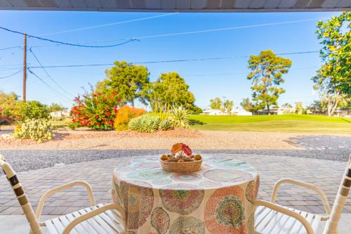 This exceptional house on the golf course has it all! Fully owned solar offers not only energy efficiency but also significant cost savings! The important items have been updated! New roof 2023, newer dual pane windows throughout, updated electrical panel, popcorn ceilings have been removed, ceiling fans in every room, updated appliances with a quiet Bosch dishwasher and a second bath added. The open floorplan creates a spacious and inviting feel. Perfectly landscaped for easy care while viewing the lush green on the 6th hole. The second bathroom offers a walk-in shower. Roomy size master with large & mirrored closets. Home faces N/S for great sunshine on the outdoor patio. Tall palms & sweet orange trees, a blooming lemon tree too! Storage/workshop off carport or possible golf cart garage. Paved golf cart parking located next to the storage is a bonus. A must see to appreciate!