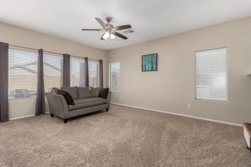 This beautiful single level, split floorplan, 3 bed + den, 2 bath residence in Skyline Ranch is looking for its new owners! Freshly painted inside and out, north/south exposure, great curb appeal, low maintenance landscape, and a 2 car garage are just the beginning. Inside you will find sizeable dining & living areas with tile in all the right places. The eat-in kitchen is open to the family room & comes equipped w/ample cabinetry, a pantry, stainless steel appliances, granite countertops, an island and butler's pantry. The primary suite showcases a full ensuite w/dual sinks , tile shower, garden tub and a walk-in closet. Also included is a nice sized backyard w/a covered patio. The community offers sand volleyball, basketball court and a playground area. This home is a true gem!