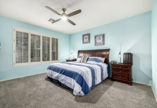 Welcome to this beautifully updated 3-bedroom, 2-bath home located in the highly sought-after gated Anthem Country Club, where country club living meets serene desert beauty. Step inside to find an inviting open layout enhanced by high ceilings and plantation shutters throughout. The elegant see-through fireplace adds warmth and charm to both the living, family room and dining spaces. *Floor Yr Updated 2020, Heating/Cool Yr Updated: 2018, Fully updated Kitchen in 2023* The gourmet kitchen is a true highlight with new cabinets, beautiful granite countertops, stainless steel appliances. Step outside to your own private desert oasis that backs to a desert wash with a covered patio, extended paver patio, tranquil 15-ft water feature, and sweeping desert and mountain views an ideal setting for relaxing evenings or hosting guests.