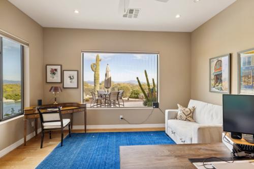 Price Reduced $525K! Great opportunity for this Exquisite 4,858 sq ft estate within the private gated community of Talon Ranch in North Scottsdale, privately positioned and surrounded by NAOS. The home is immersed in the serene Sonoran Desert and offers unobstructed mountain and sunset views of Tom's Thumb, Pinnacle Peak, and the Four Peaks Mountain Range afforded by its unusually high elevation. This impeccably designed residence offers unusual privacy, surrounded by wonderful open space and features 4 bedrooms, 4.5 baths, a private office and bonus/media room and dedicated air conditioned exercise room, delivering both elegance and versatility. Oak wood flooring and wood ceiling and beams in the great room provide a warm ambiance. The chef's kitchen is exceptionally appointed with custom cabinetry, Sub-Zero side by side fridges, ice maker, Wolf double ovens, gas cooktop, and Miele dishwasher. The formal dining room is enhanced by two built-in Sub-Zero wine refrigerators and built-in sideboard, ideal for refined entertaining. Storage is abundant throughout the home with thoughtfully designed cabinetry. Comfort and ambiance are elevated with two indoor gas fireplaces, while the home is fully wired with Ethernet, Control 4 and keypads, and Ring security cameras for ease and convenience. Outdoor living is equally impressive, featuring an expansive travertine patio, resort--style pool and spa, built-in gas BBQ, Big Green Egg charcoal grill, outdoor fire pit, and an elevated seating area perfectly positioned for enjoying majestic Arizona sunsets. The upgraded 3-car garage includes epoxy floors, storage cabinets, and a workbench. A rare offering that seamlessly blends luxury, privacy, and iconic desert surroundings.