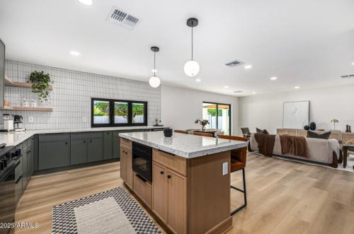 Discover mid-century charm in this fully permitted, top-to-bottom remodel! 4-bed, 2-bath home in the coveted Litchfield Park Proper. Premium corner lot adjacent to a serene park, with exceptional curb appeal, manicured artificial turf landscape, and 2-car garage. Inviting open floor plan boasts a chef's kitchen: slim shaker cabinets, terrazzo quartz counters, designer black appliances, accordion window with bar seating for outdoor entertaining. Split primary suite offers patio access, walk-in closet, and lavish ensuite. Expansive backyard includes covered patio/pergola and tiled flagstone seating. New AC, roof, ducts, main sewer line, water heater! Partially new wiring and water lines!