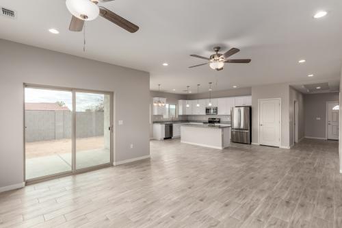 MOVE-IN READY! Stunning brand-new 3-bedroom, 2-bath home situated on a spacious 15,700 sq ft lot with no HOA! This thoughtfully designed home features a bright and open Great Room floorplan with soaring 9 ft ceilings and an oversized 2-car garage. The chef-inspired kitchen is a true highlight, offering a large center island with pendant lighting, granite countertops, stainless steel appliances (range/oven, microwave, refrigerator, and dishwasher), and two pantries for plenty of storage. The split layout provides privacy, with the spacious Primary Suite offering a walk-in closet, double sink vanity, and a beautifully tiled designer shower. Bedrooms 2 and 3 are ideally located on the opposite side of the home with a well-appointed guest bathroom in between. Additional upgrades include ceramic tile flooring throughout with carpeted bedrooms, recessed lighting in the living and kitchen areas, modern ceiling fans, upgraded fixtures, and two-tone interior paint. Outside, enjoy the block-fenced yard, paved driveway, and a convenient drive-through RV gate, perfect for extra parking or recreational toys. Home is under construction and the estimated completion is August 2025. Photos shown are of a similar home; actual finishes and color scheme may vary. Don't miss your chance to own this exceptional home in a growing area!