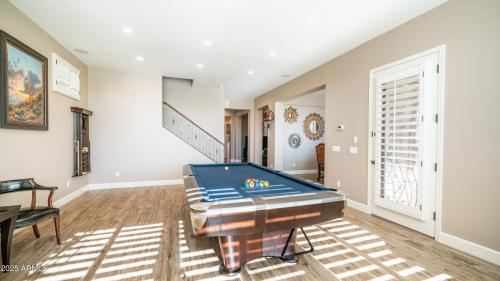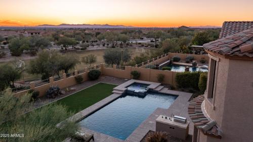 Absolutely stunning, this executive luxury home sits on a premium VIEW lot backing to a lush green park in the prestigious gated community of Legacy Estates at Mountain Bridge. Enjoy breathtaking Arizona sunsets, sparkling city lights, and panoramic mountain views right from your own backyard oasis. Remodeled since 2022 with over $200,000 in upgrades, this expansive 5,300 sq ft residence features 6 bedrooms, 6.5 bathrooms, and a true 5-car garage, the perfect blend of elegance, comfort, and space for everyone. Inside, the thoughtful floor plan offers exceptional flexibility for multigenerational living or hosting guests. The home features two primary bedrooms, including a main-level suite that functions as a full-attached casita with a mini-kitchen, large bathroom with dual sinks, and walk-in closet. All additional bedrooms are oversized and include en-suite bathrooms. You are welcomed through a charming courtyard into multiple living spaces, including a sitting/bonus room and a huge family room. The gourmet kitchen is every chef's dream, complete with a large island, premium Cambria Signature Series Quartz countertops (matching those found in all bathrooms and the laundry room), a Wolf gas cooktop, a Wolf oven, Cove dishwasher, a double Sub-Zero refrigerator/freezer, and an oversized walk-in pantry. The spacious breakfast room overlooks the backyard and flows seamlessly into the dining room. Downstairs laundry for convenience, plus an additional upstairs laundry room. The upper level offers a second family/game room, another bonus/sitting area, and a spacious master retreat with a spa-inspired bathroom featuring dual vanities, large walk-in shower, bathtub, and an expansive walk-in closet. Step out onto the private balcony and take in the sweeping views of the valley, city lights, breathtaking sunsets and surrounding mountains. During the Fourth of July, New Year's, and other holidays, you are treated to spectacular fireworks displays across the valley, often seeing dozens of shows at once, visible from the balcony and upstairs rooms. Your private outdoor paradise features a huge, heated diving pool with spa (resurfaced in 2025 and equipped with a new Variable Speed pump), covered patio and complete privacy with no neighbor behindjust the serene greenbelt and unmatched views. The upgraded SynLawn Superyarn artificial turf with premium infill provides a lush, low-maintenance green space year-round. The adjacent park provides instant access to soccer nets, a basketball court, a playground, and a large greenbelt for recreation. Additional features: High ceilings, plantation shutters throughout, oversized tile floors flow throughout the entire home, Haiku ceiling fans for ultimate comfort, tons of storage, hard-wired for Ethernet throughout, and an ideal layout for entertaining and everyday living. This exceptional home delivers luxury, space, and unforgettable views enhanced by the resort-style amenities of the prestigious Mountain Bridge. Set amidst the natural beauty of the Upper Sonoran Desert surrounded by some of the best hiking and biking trails in Arizona. This stunning master-planned community offers resort-style living for all ages with amenities that include Pool, Tennis, Pickleball, Basketball, Fitness Center, Playground, Clubhouse, Walking and Biking Trails and more. Fantastic location with Great Schools, Restaurants and Shopping, just one mile to the 202 freeway, 15 minutes to Saguaro Lake and just 20 Minutes to Sky Harbor, Mesa Gateway Airports and Scottsdale. Experience the perfect blend of luxury and resort-style living, surrounded by the breathtaking natural beauty of the Sonoran Desert.