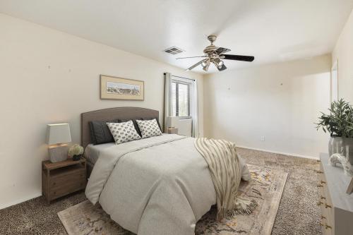 Close to the 51 & the 101 Freeways, restaurants, schools, shopping, Post Office & so much more. Walking distance to Elementary school & Palomino park just east of the community. This spacious 3 bedroom, 2.5 bath home includes a well maintained Kitchen w/granite countertops, stainless steel appliances including a newer refrigerator & dishwasher, Breakfast Bar, open to Great Room updated flooring throughout the downstairs area, Enjoy private low maintenance backyard with covered patio, Water feature(as-is) Plus shade awnings & lights that remain. Upstairs your spacious Owners Suite includes a walk in closet, Full bath with tub/shower, down the hall are bedrooms 2 & 3, hall bath & laundry, Washer & Dryer remain too! Also a 2 car garage too