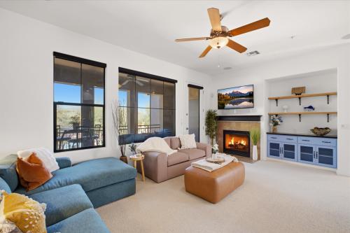 Nestled comfortably within the gated Encore community, this townhome is a showcase of views: enjoy the full expanse of the resort-style pool oasis from the private covered patio and primary suite, while guest rooms and dining area frame the majestic McDowell Mountains. The light-filled, open layout flows perfectly for entertaining or simple enjoyment of the leisurely vibe afforded by a fun and fresh interior and scenic beauty from every window. Easy walk to upscale boutiques at Market Street at DC Ranch or enjoy local favorites like Isabella's or MoJo's Coffee across the street. Perfectly suited as a primary residence, lock-and-leave, or high-end investment, this North Scottsdale home blends leisure and comfort with easy proximity to Loop 101, Mayo Clinic, and abundant outdoor activities.